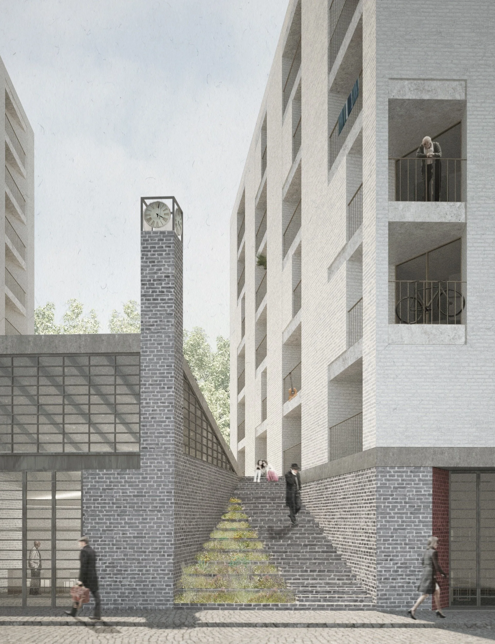 The project redevelops an existing industrial site in Southwark by providing a mixed-use scheme comprising residential, commercial and light industrial units. The site, historically occupied by railway infrastructure and later converted to industrial use, is located within a predominantly residential area and adjacent to a local primary school. The proposal was developed in careful response to the identified site parameters and site-specific conditions, in particular daylight/ sunlight, privacy/ overlooking and environmental considerations. The resulting massing responds to the existing urban grain to the South of the site and maintains key views through the development. The views through the development are maximised through the sculpting of the blocks. Their stepped sections result in a set back at upper levels, providing amenity space in the form of communal roof terraces. Overlooking is minimised by reducing the extent of the facades facing the schoolyard. Buildings and amenity spaces are distributed to maximise the amount of daylight and avoid the blocking of sunlight from the South. The proposal takes advantage of an existing difference in levels within the topography along the Southwest perimeter of the site. This condition helped to separate uses within the development and allowed the creation of below ground commercial and light industrial areas, without the need for major excavations. The shared 'podium' level provides south-facing communal amenity spaces to the residential blocks. Light coloured brickwork distinguishes the residential block from the darker tone of brick proposed for the podium structure. The commercial and light industrial base of the project takes reference from Victorian railway and industrial architecture, both in its materiality and scale of openings.