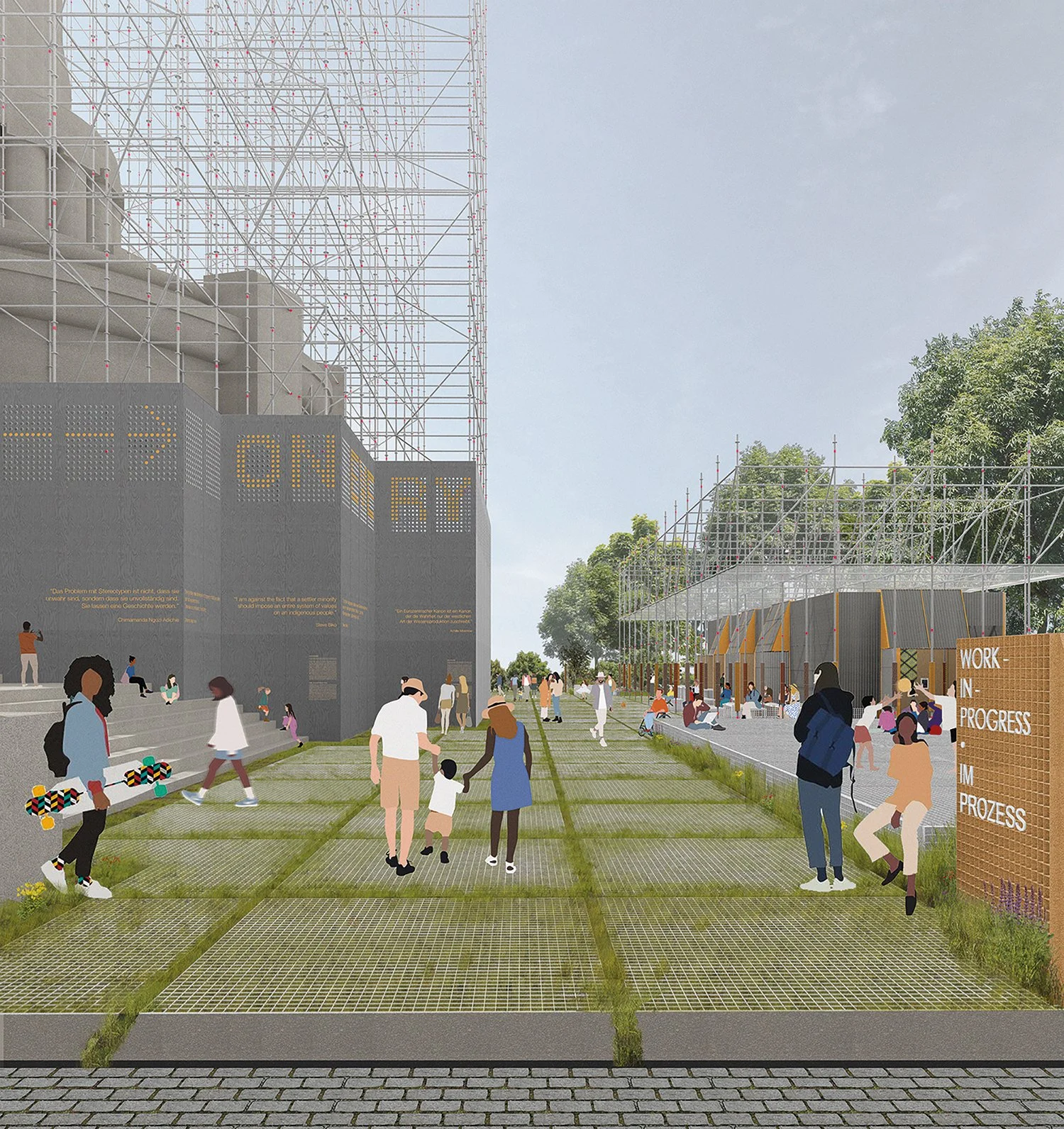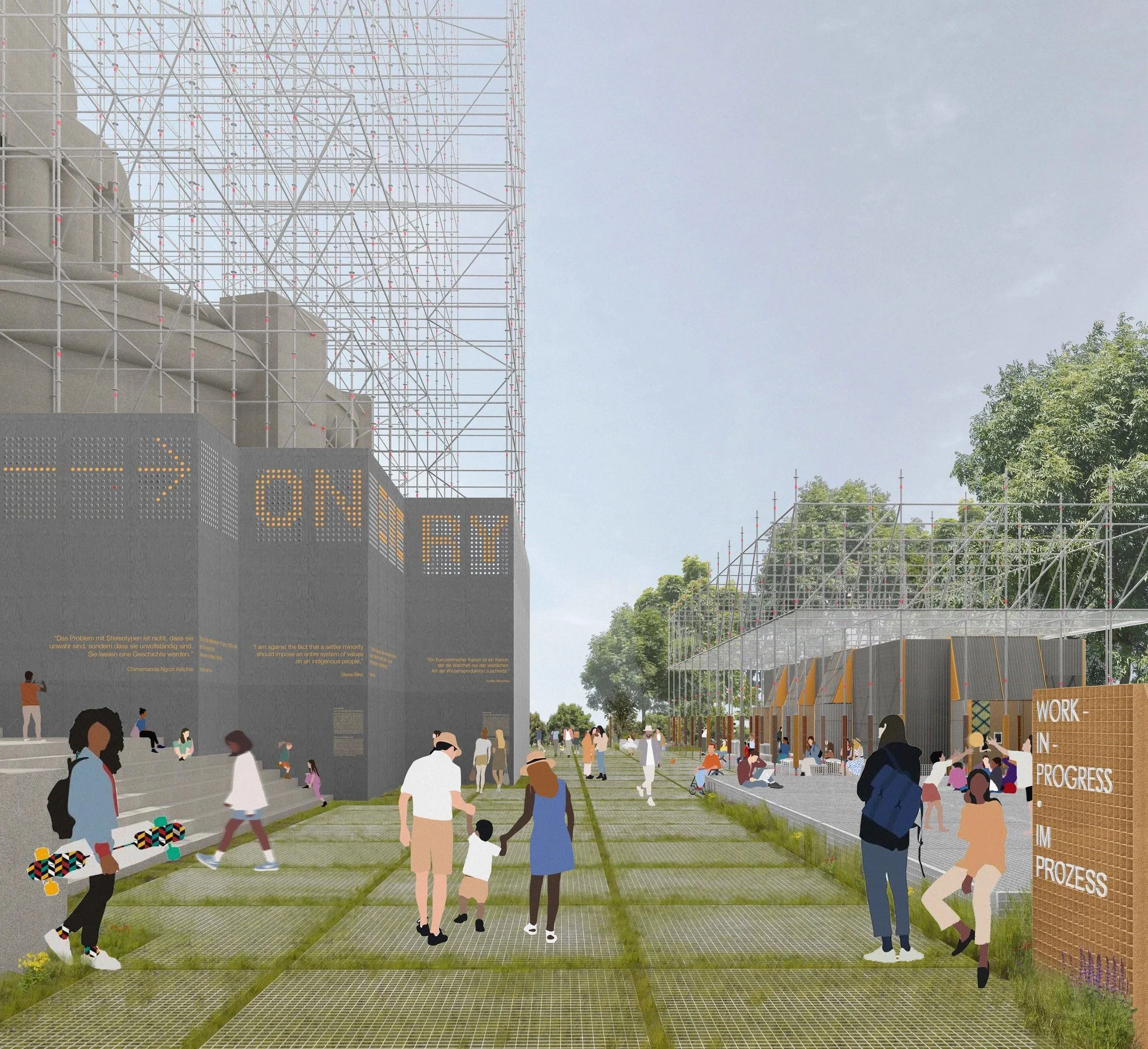 Decolonising is a process. For this reason, this proposal cannot suggest a solution for a complex and complicated monument but instead proposes a place and space to support, encourage, sustain, and advocate a public and open process of decolonising. To mark the evolving, ‘work-in progress’ nature of this process, we propose to encase the Bismarck Monument in scaffolding which will expand the visibility of the monument while making itself invisible. The scaffolding will not completely hide the monument but will suggest an instability and volatility of ‘hiding while revealing’, highlighting the unresolved history and need to foster critical debates in attempts to find adequate responses. But not only the size and gesture of the scaffold but its function to disrupt a common view and disguise a familiar element of public space should serve as a stimulus to question, search for answers, attract visits and gathering. While visible from afar and from multiple points within the city, the scaffolding will also serve as a reminder of the work that needs to be undertaken to decolonise Hamburg. In many respects, with the monument encased by scaffolding, the project ‘Decolonise Hamburg!’ will receive its most visible public manifestation as work in process and under construction while equally supporting connotations of processes of maintenance, care, repair, and healing.